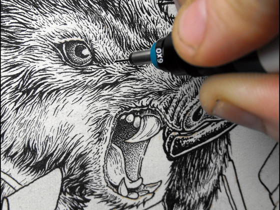 Twice a year, the “Bees” go on tour to publicize their campaigns by delivering presentations around the country. I had the opportunity to witness their presentation on The True Cost of Coal, an intricate collaborative illustration that draws attention to the issue of mountaintop removal mining, a method of coal mining that requires the removal of mountain summits for easier resource extraction. I was also able to discuss other graphics campaigns, notably Free Trade of the Americas, with members of the Collective as well as other volunteers. While the posters show stylistic nuances—a result of the illustrators’ varying artistic modes and drawing techniques—the overall style of the posters is consistent. The viewer is first assaulted with a harsh, sharply contrasted black-and-white thicket of imagery. The confrontational nature of these posters is magnified by the monumental size, as the original illustrations are large enough to span a small room. The size also works to underline the vastness of the issues that the posters deal with, and to unravel the mass of images on each poster requires tremendous attention to detail.